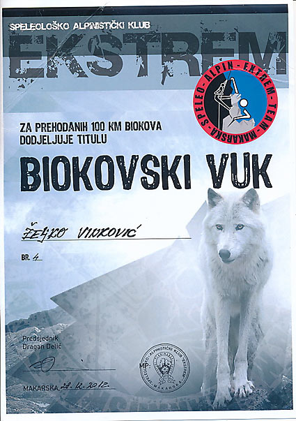 Još dva sata mi je trebalo da se spustim kroz negostoljubiv teren prepun kamenih gromada sa grebena prema selu Rudinama i izlazu na asfalt, bjelovarski planinari dobili su svog Biokovskog vuka. Šaljem imenjaku Bockovcu sms-poruku: Akcija Biokovski vuk završena u 13.42, počinje evakuacija – tražim autobusnu stanicu. Pješačim još 5 kilometara do Gradca pa autobusom do Splita gdje konačno uživo upoznajem imenjaka, prijatelja i ljudinu Željka Bockovca. Cijelu pripremu akcije odradili smo putem e-mailova, stalno nam je bio pri ruci putem mobitela pa mu zahvaljujem za sve savjete, sugestije i ohrabrenja. Teško mi je opisati moj osjećaj ponosa, sreće i poštovanja prema njegovom, a sada i „mom“ Biokovu koje je dopustilo da ga „stranac“ upozna u svoj njegovoj ljepoti i divljini i tako mu bude puno jasnije zašto je zovu dalmatinskom kraljicom planina.
